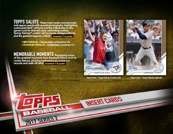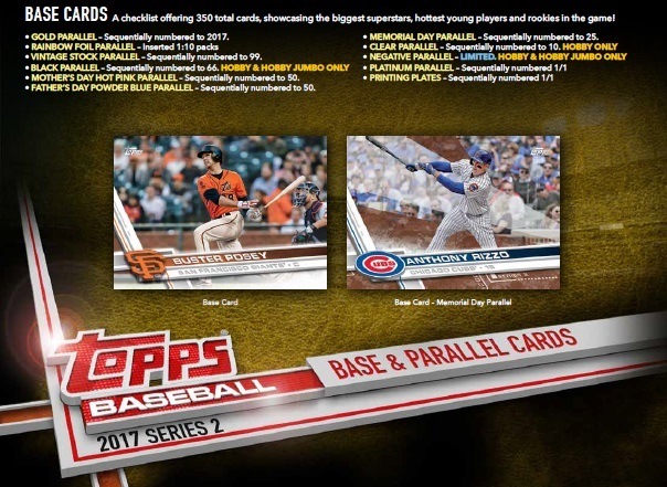 *パラレルセットは、ゴールド(2017枚)、レインボーフォイル(1:10パック)、昔のカード紙風ヴィンテージストック(99枚)、ブラック(66枚)、母の日ホットピンク(50枚)、父の日ブルー(50枚)、メモリアルデイ迷彩(25枚)、クリアー(10枚)、ネガティブ(限定)、プラチナム(1OF1)、印刷プレート(1OF1)