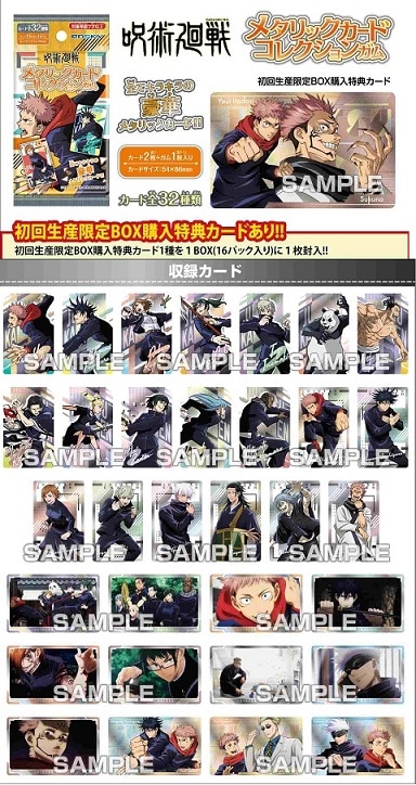 ■1ボックス16パック入り。1パック、メタリックカード2枚+ガム1枚(板ガム、ソーダ味)入り。■★初回生産限定BOX特典カードが封入!「呪術廻戦」のメタリックカードコレクションガムが新登場。全種類表面にメタリック加工を施した豪華なカードコレクションです。【カード構成】全32種1ボックスで全てのカードは揃いません。