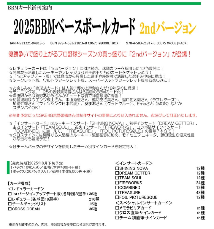 2025 BBM ベースボールカード 2ndバージョン BOX■6ボックスセット■(送料無料) 2025年9月3日発売