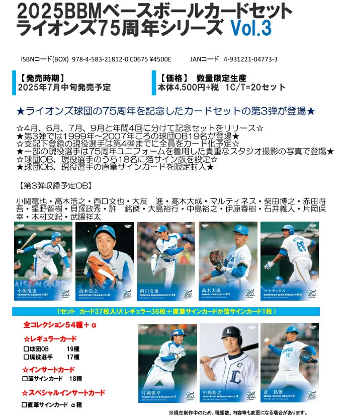 2025 BBM ベースボールカードセット ライオンズ75周年シリーズ Vol.3■カートン(20箱入)■ (送料無料) 2025年7月17日発売
