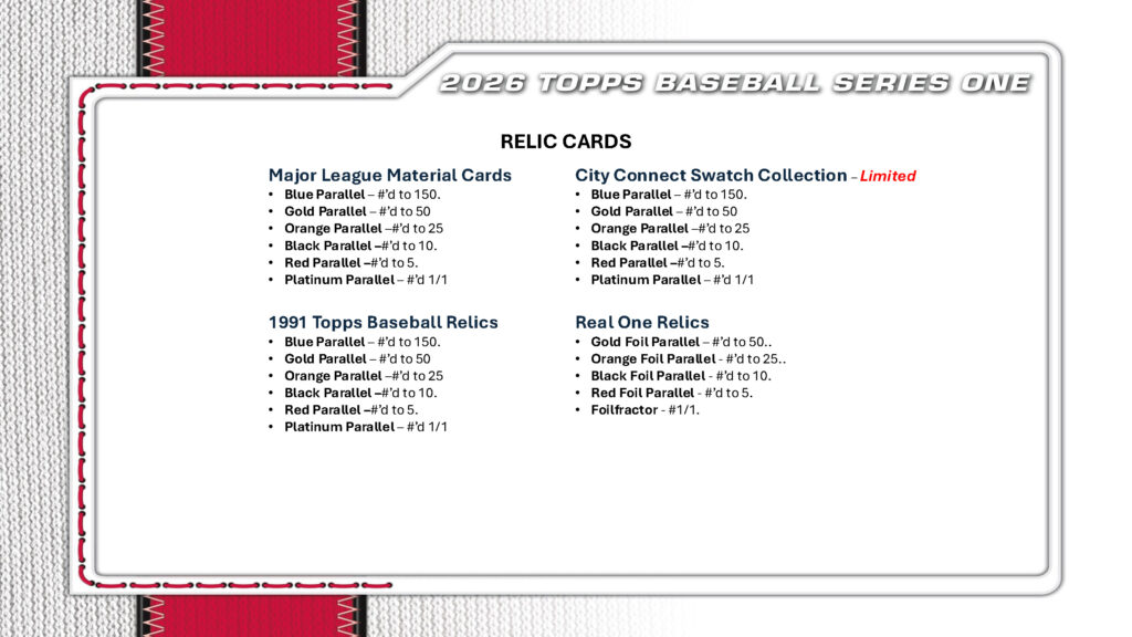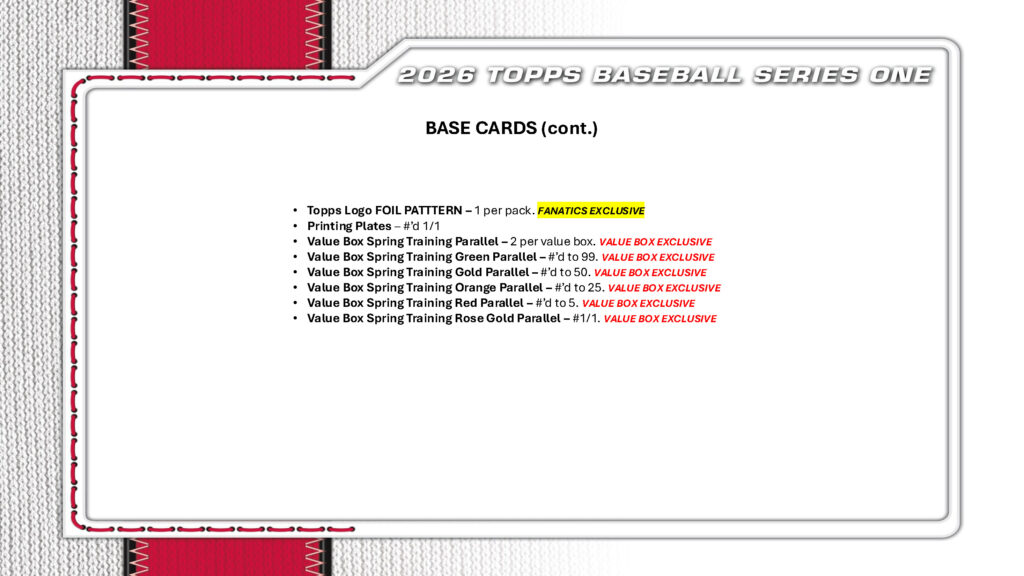■1ボックス6パック入。1パック12枚入。■ トップス社からMLB公式ベースボールカード「トップス・ベースボール・シーズン第1弾」の2026年バリューボックス版が登場! 現役選手、レジェンド、注目ルーキーをベース、インサート、オート&レリックカードで収録! ★ホビーボックス開封ヒット ◇ Value Box スプリングトレーニングベースパラレル: 2~3枚 [R]:リテール版限定 [V]: バリューボックス版限定 [MB]:メガボックス版限定 ★ベース 350種類。MLBスター、ルーキー、フューチャースター、リーグリーダー、チームカードなどを収録! ★インサート 2025 All Topps Team (新登場) 2025シーズンで各ポジション最優秀選手に授与! Topps Profiles (新登場) Big Ticket Players (新登場) 2025 Greatest Hits 2025シーズンの名場面集! First Pitch パラレル ⇒ ピンク箔(枚数限定)、青箔/150、緑箔/99、金箔/50、橙箔/25、 黒箔/10、赤箔/5、フォイルフラクター1/1 All Aces & All Kings (枚数限定) 革新的テクノロジーで、歴代&現役最高の投手をフィーチャー! Heavy Lumber リーグ屈指の打者20名をウッドグレイン仕様カードで収録! 1991 Topps Baseball (新登場) この名デザイン35周年を記念し、往年&現役選手を収録! パラレル ⇒ ピンク(枚数限定)、クラックル箔(枚数限定)[MB]、鯉(新登場・ジャパン限定・1/4パック)、 ピンククラックル箔(新登場・1/5ボックス)[MB]、青クラックル箔(新登場)/150[MB]、青(新登場)/150、 緑クラックル箔/99[MB]、緑(新登場)/99、The Real One/91、金/50、金クラックル箔/50[MB]、 鯉 金(新登場・ジャパン限定)/50、橙クラックル箔/25[MB]、橙/25、鯉 橙(新登場・ジャパン限定)/25 黒クラックル箔/10[MB]、黒/10、鯉 黒(新登場・ジャパン限定)/10、赤/5、 赤クラックル箔/5[MB]、鯉 赤(新登場・ジャパン限定)/5、フォイルフラクター1/1(新登場) Base Card 1952 Variation (新登場) トップルーキーは、1952 ToppsデザインのSSPルーキーカードを収録! Cover Athletes Cards (新登場) 歴代Toppsフラッグシップのカバーデザインを称えるSPインサート! ★リテール版限定 Stars of the MLB® 現役トップ選手。30種類! パラレル ⇒ クラックル箔(新登場・枚数限定)[MB]、緑箔/99、金箔/50、金クラックル箔(新登場)/50 [MB]、橙箔/25、橙クラックル(新登場)/25[MB]、黒箔/10、黒クラックル(新登場)/10[MB]、赤箔/5、 赤クラックル(新登場)/5[MB]、フォイルフラクター1/1 Titans of the Game (新登場) 20種類。パラレル ⇒ クラックル箔(枚数限定)[MB]、緑箔/99、金箔/50、金クラックル箔/50[MB]、 橙箔/25、橙クラックル/25[MB]、黒箔/10、黒クラックル/10[MB]、赤箔/5、 赤クラックル/5[MB]、フォイルフラクター1/1 ★直筆サイン&レリック Major League Material オート /50。パラレル ⇒ 橙/25、黒/10、赤/5、プラチナ1/1 Major League Material デュアルオート (新登場) /50。パラレル ⇒ 橙/25、黒/10、赤/5、プラチナ1/1 City Connect Swatch Collection オート (新登場・枚数限定) パラレル ⇒ 金/50、橙/25、黒/10、赤/5、プラチナ1/1 Heavy Lumber オートレリック (枚数限定) ★直筆サイン Baseball Stars ゲームのスター選手!パラレル ⇒ 青/150、緑/99、金/50、橙/25、黒/10、赤/5、プラチナ1/1 1991 Topps Baseball 1990デザインで、ルーキー、スター、レジェンドのオンカードオート!パラレル ⇒ 青(新登場)/150、 緑(新登場)/99、金/50、橙/25、黒/10、赤/5、フォイルフラクター(新登場)1/1 First Pitch /99。金/50、橙/25、黒/10、赤/5、フォイルフラクター1/1 Flagship Real One (新登場・枚数限定) 好評につき再登場!注目選手のベースカード仕様直書きサインを収録!パラレル ⇒ 緑箔(新登場)/99、 Topps 75周年(新登場)/75、金箔/50、橙箔/25、黒箔/10、赤箔/5、フォイルフラクター1/1 Base Card 1952 (新登場) 1952 Toppsデザインで、トップルーキーの直書きサイン!パラレル ⇒ 赤/5(赤インクサイン)、 黒1/1(金インクサイン) 75 Years of Topps Baseball (新登場) 野球以外の著名人が、Topps野球75周年を祝福! 75 Years of Topps ダイカット (新登場) 歴代&現役トップMLB選手、ダイカットオート! Cover Athletes 歴代Toppsフラッグシップカバー、掲載選手の直書きサイン! Signature Tunes デュアルオート 選手の登場曲アーティスト! ★レリック Major League Material パラレル ⇒ 青/150、金/50、橙/25、黒/10、赤/5、プラチナ1/1 1991 Topps Baseball パラレル ⇒ 同上 City Connect Swatch Collection (枚数限定) パラレル ⇒ 同上 Real One パラレル ⇒ 金箔/50、橙箔/25、黒箔/10、赤箔/5、フォイルフラクター1/1 ★バイバック&リデンプション (新登場) 各パートナーからの特別ギフトと交換可能! ※1ボックスですべてのカードは揃いません。 ※40ボックス注文の際はカートン出荷となります。 ※商品構成・内容に関しては制作中の情報につき予告なく変更になる場合があります。 ※封入率に関する情報は生産数に対する割合であり、ボックス内の出現を保証するものではありません。