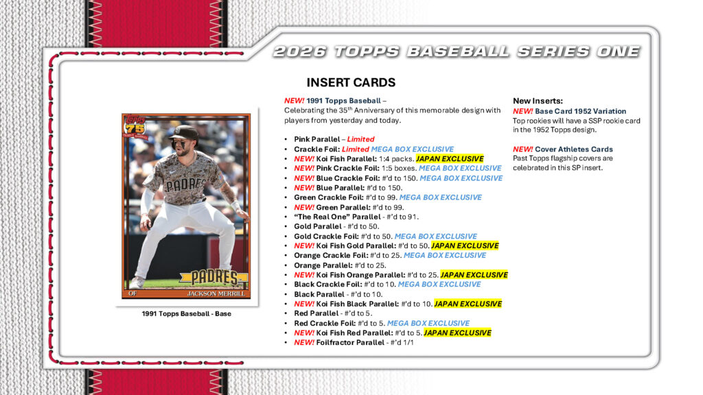 ■1ボックス14パック入。1パック14枚入。■ トップス社からMLB公式ベースボールカード「トップス・ベースボール・シーズン第1弾」の2026年メガボックス版が登場! 現役選手、レジェンド、注目ルーキーをベース、インサート、オート&レリックカードで収録! ★ホビーボックス開封ヒット ◇ 1991 Topps Baseball クラックル箔: 3枚 [R]:リテール版限定 [V]: バリューボックス版限定 [MB]:メガボックス版限定 ★ベース 350種類。MLBスター、ルーキー、フューチャースター、リーグリーダー、チームカードなどを収録! ★インサート 2025 All Topps Team (新登場) 2025シーズンで各ポジション最優秀選手に授与! Topps Profiles (新登場) Big Ticket Players (新登場) 2025 Greatest Hits 2025シーズンの名場面集! First Pitch パラレル ⇒ ピンク箔(枚数限定)、青箔/150、緑箔/99、金箔/50、橙箔/25、 黒箔/10、赤箔/5、フォイルフラクター1/1 All Aces & All Kings (枚数限定) 革新的テクノロジーで、歴代&現役最高の投手をフィーチャー! Heavy Lumber リーグ屈指の打者20名をウッドグレイン仕様カードで収録! 1991 Topps Baseball (新登場) この名デザイン35周年を記念し、往年&現役選手を収録! パラレル ⇒ ピンク(枚数限定)、クラックル箔(枚数限定)[MB]、鯉(新登場・ジャパン限定・1/4パック)、 ピンククラックル箔(新登場・1/5ボックス)[MB]、青クラックル箔(新登場)/150[MB]、青(新登場)/150、 緑クラックル箔/99[MB]、緑(新登場)/99、The Real One/91、金/50、金クラックル箔/50[MB]、 鯉 金(新登場・ジャパン限定)/50、橙クラックル箔/25[MB]、橙/25、鯉 橙(新登場・ジャパン限定)/25 黒クラックル箔/10[MB]、黒/10、鯉 黒(新登場・ジャパン限定)/10、赤/5、 赤クラックル箔/5[MB]、鯉 赤(新登場・ジャパン限定)/5、フォイルフラクター1/1(新登場) Base Card 1952 Variation (新登場) トップルーキーは、1952 ToppsデザインのSSPルーキーカードを収録! Cover Athletes Cards (新登場) 歴代Toppsフラッグシップのカバーデザインを称えるSPインサート! ★リテール版限定 Stars of the MLB® 現役トップ選手。30種類! パラレル ⇒ クラックル箔(新登場・枚数限定)[MB]、緑箔/99、金箔/50、金クラックル箔(新登場)/50 [MB]、橙箔/25、橙クラックル(新登場)/25[MB]、黒箔/10、黒クラックル(新登場)/10[MB]、赤箔/5、 赤クラックル(新登場)/5[MB]、フォイルフラクター1/1 Titans of the Game (新登場) 20種類。パラレル ⇒ クラックル箔(枚数限定)[MB]、緑箔/99、金箔/50、金クラックル箔/50[MB]、 橙箔/25、橙クラックル/25[MB]、黒箔/10、黒クラックル/10[MB]、赤箔/5、 赤クラックル/5[MB]、フォイルフラクター1/1 ★直筆サイン&レリック Major League Material オート /50。パラレル ⇒ 橙/25、黒/10、赤/5、プラチナ1/1 Major League Material デュアルオート (新登場) /50。パラレル ⇒ 橙/25、黒/10、赤/5、プラチナ1/1 City Connect Swatch Collection オート (新登場・枚数限定) パラレル ⇒ 金/50、橙/25、黒/10、赤/5、プラチナ1/1 Heavy Lumber オートレリック (枚数限定) ★直筆サイン Baseball Stars ゲームのスター選手!パラレル ⇒ 青/150、緑/99、金/50、橙/25、黒/10、赤/5、プラチナ1/1 1991 Topps Baseball 1990デザインで、ルーキー、スター、レジェンドのオンカードオート!パラレル ⇒ 青(新登場)/150、 緑(新登場)/99、金/50、橙/25、黒/10、赤/5、フォイルフラクター(新登場)1/1 First Pitch /99。金/50、橙/25、黒/10、赤/5、フォイルフラクター1/1 Flagship Real One (新登場・枚数限定) 好評につき再登場!注目選手のベースカード仕様直書きサインを収録!パラレル ⇒ 緑箔(新登場)/99、 Topps 75周年(新登場)/75、金箔/50、橙箔/25、黒箔/10、赤箔/5、フォイルフラクター1/1 Base Card 1952 (新登場) 1952 Toppsデザインで、トップルーキーの直書きサイン!パラレル ⇒ 赤/5(赤インクサイン)、 黒1/1(金インクサイン) 75 Years of Topps Baseball (新登場) 野球以外の著名人が、Topps野球75周年を祝福! 75 Years of Topps ダイカット (新登場) 歴代&現役トップMLB選手、ダイカットオート! Cover Athletes 歴代Toppsフラッグシップカバー、掲載選手の直書きサイン! Signature Tunes デュアルオート 選手の登場曲アーティスト! ★レリック Major League Material パラレル ⇒ 青/150、金/50、橙/25、黒/10、赤/5、プラチナ1/1 1991 Topps Baseball パラレル ⇒ 同上 City Connect Swatch Collection (枚数限定) パラレル ⇒ 同上 Real One パラレル ⇒ 金箔/50、橙箔/25、黒箔/10、赤箔/5、フォイルフラクター1/1 ★バイバック&リデンプション (新登場) 各パートナーからの特別ギフトと交換可能! ※1ボックスですべてのカードは揃いません。 ※20ボックス注文の際はカートン出荷となります。 ※商品構成・内容に関しては制作中の情報につき予告なく変更になる場合があります。 ※封入率に関する情報は生産数に対する割合であり、ボックス内の出現を保証するものではありません。