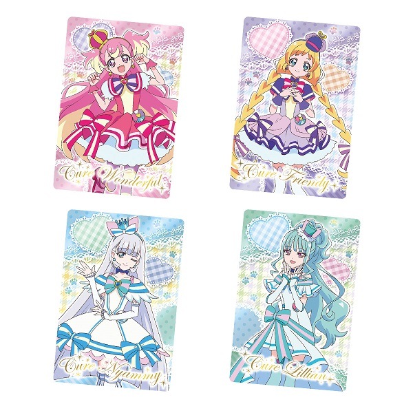 キミとアイドルプリキュア♪の描き下ろしオリジナルイラストが楽しめます!映画に合わせたラインナップをお楽しみいただけます♪カード表面は全種光沢感のあるキラキラプラカードで、全23種のうち4種のホロレアカードはホログラムに光り輝く豪華仕様です。トレーグミの形状は全4種。
